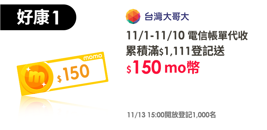 11/1-11/10於momo使用電信帳單代收購物,累積消費滿1,111元以上,並於登記連結完成登記,可享150 mo幣,每位momo帳戶每波可登記1次,活動期間內最多回饋乙次。