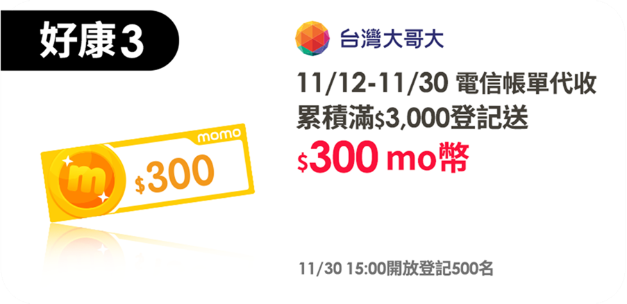 11/12-11/30於momo使用電信帳單代收購物,累積消費滿3,000元以上,並於登記連結完成登記,可享300 mo幣,每位momo帳戶每波可登記1次,活動期間內最多回饋乙次。