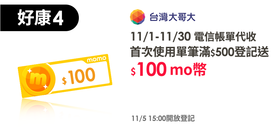 11/1-11/30於momo首次使用電信帳單代收購物(以用戶結帳使用之台灣大哥大門號判斷),單筆消費滿500元以上,並於登記連結完成登記,可享100 mo幣,每戶最多可以參加乙次,每位用戶活動期間內限登記一次,活動期間內最多回饋1次。