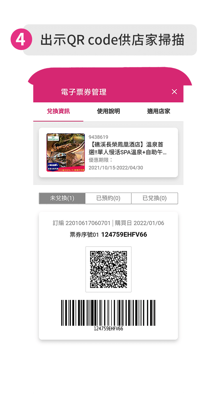 - 本商品採電子票券的方式兌換,可使用列印或於手機出示電子票券提供店家進行核銷。