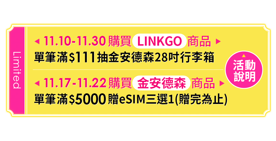 11月聯慶活動★LinkGO單筆滿$111抽28吋行李箱;金安德森單筆滿$5000贈eSIM三選一