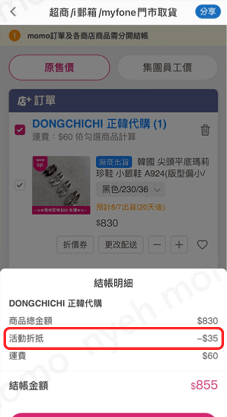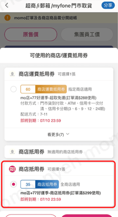 3.在mo店+的商品購物車選擇[商店/運費抵用券]