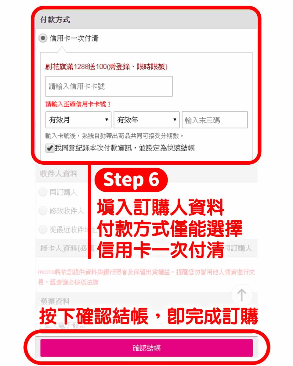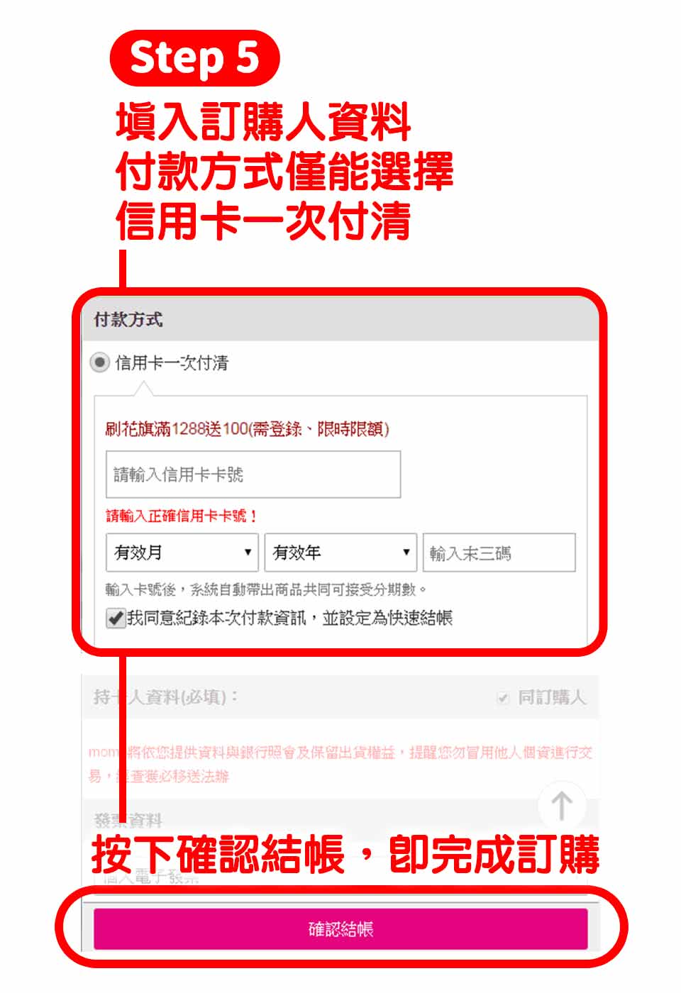 當您使用定期訂購服務,momo購物網將依您所選擇的條件,自動於每個週期使用您所設定的信用卡訂購商品。第一次訂購時要選信用卡(限一次付清),之後的週期訂單都是刷同一張信用卡。