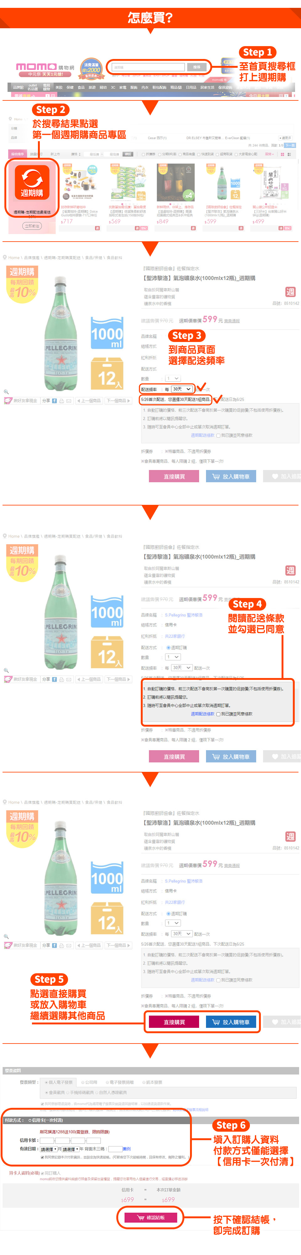 - 付款方式:週期訂購服務限使用信用卡付款(刷卡限1期 ),momo購物網將依您所選擇的條件,自動於每個週期使用您所設定的信用卡訂購商品。