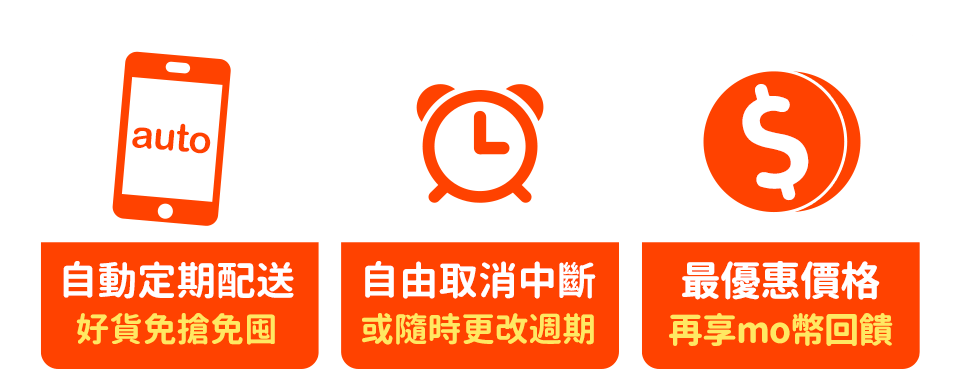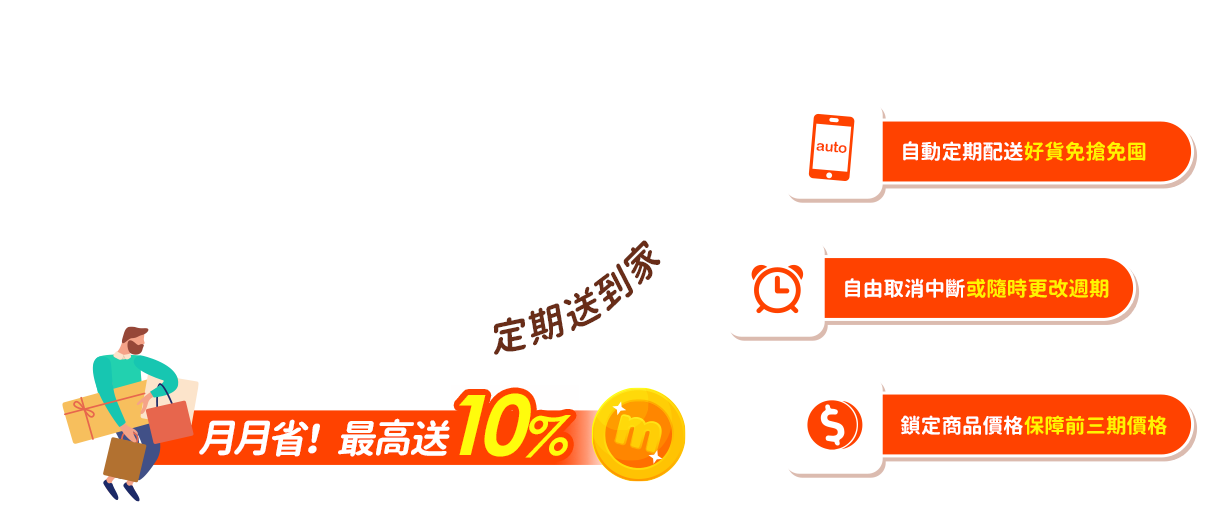 注意:定期訂購可能因商品暫停供貨、商品下架等原因而自動中斷,若定期訂購中斷,momo幣回饋僅限於已成立且無取消、退貨或終止之訂單,並依各方案規則回饋,將不提供未成立訂單之momo幣回饋。適用於所有定期配訂單,包含上述各回饋方案之活動日期區間。