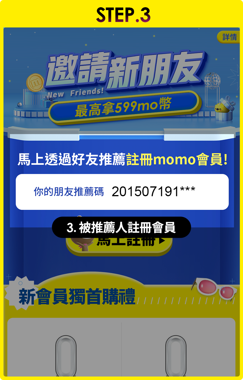 Step 3-2.被推薦人填寫你的推薦碼註冊後,並在2025/11/30 23:50前於momo購物網完成首次消費且首次消費金額滿$99,方符合成功推薦(mo店+、購買點數、momo紅利金、代收代付等訂單,不列入計算)。