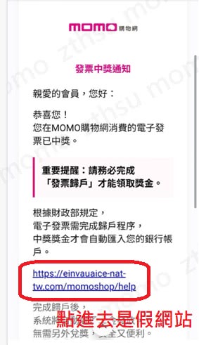 近期有不法分子假冒「財政部電子發票整合服務平台」名義寄送詐騙郵件以「您在momo購物網購買商品已中獎」為由謊稱載具資訊異常、請更新載具帳戶等,誘騙民眾點擊信中連結進入假冒網頁、輸入個資。