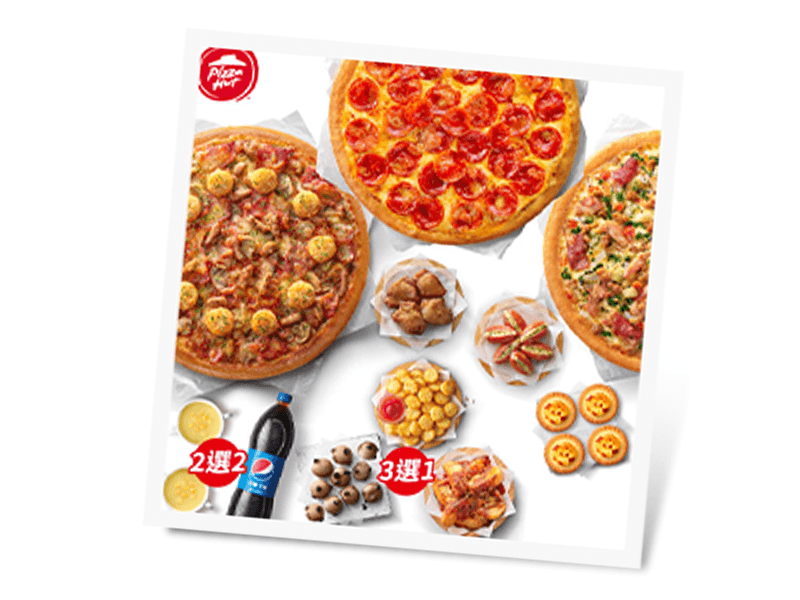 - 3個9吋鬆厚比薩(限定NT$410元(含)以下口味)+4塊BBQ厚燒醬烤腿排+6條德國芝心腸+4顆冰藏起司塔+1份薯金幣(大)或10顆麻糬QQ球或起司肉醬薯瓣(3選1)+1瓶1.25L可樂或2杯玉米濃湯(任選2項)