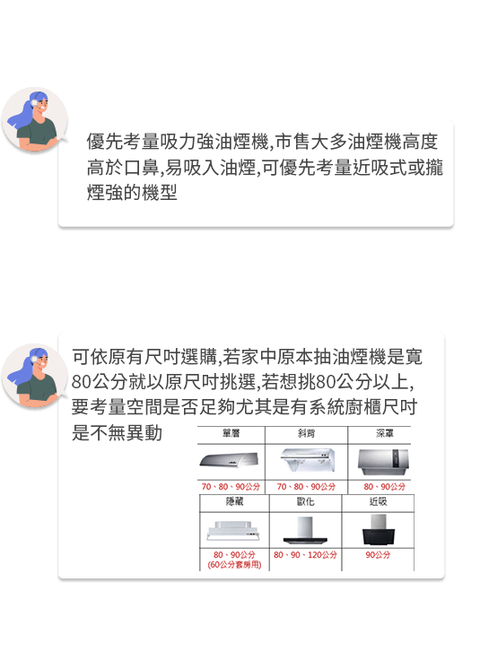 當廚房空間與油煙距離都測量好後,就只要挑選到功能齊全、外觀符合其居家設計的抽油煙機即可。
