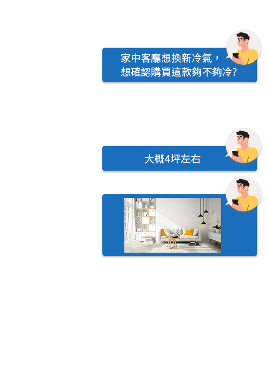 計算時除了空間大小,還須把格局及熱源等條件考慮進去。如不會判斷可以利用問問功能,拍攝環境照片由專人為您確認!