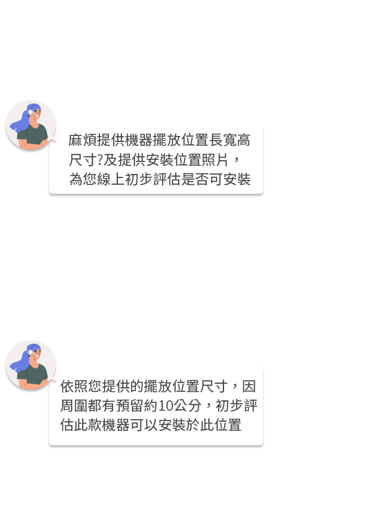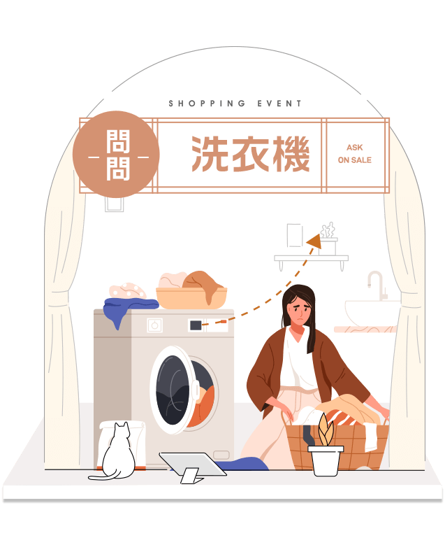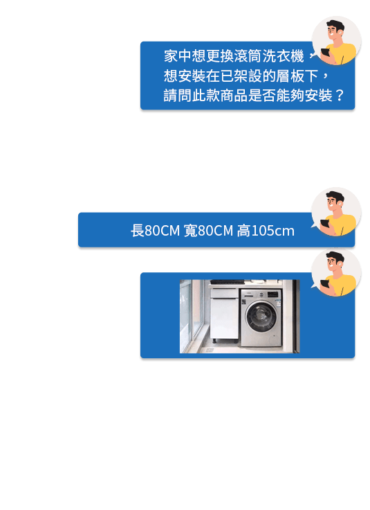 A:請先測量機器搬運時需經過的大門、走道、電梯、樓梯口…等的高度及寬度,確認搬運可順利通過再測量安裝位置長寬高、排水口高度及排水孔位置,並確認電源(110V或220V)配置、水龍頭款式、水龍頭高度,若購買滾筒洗衣機,請同步確認開門方向,若有改門需求可使用問問功能詢問是否有此項服務