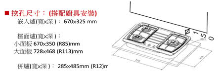 A:挖孔尺寸應照安裝說明書內挖孔尺吋請廠商施工,: (搭配廚具安裝),避免挖孔過大或過小.另安裝瓦斯爐時要注意,爐具面板邊緣建議需距離壁面15公分以上,避免壁磚龜裂,不然建議加裝隔熱板在壁面上。