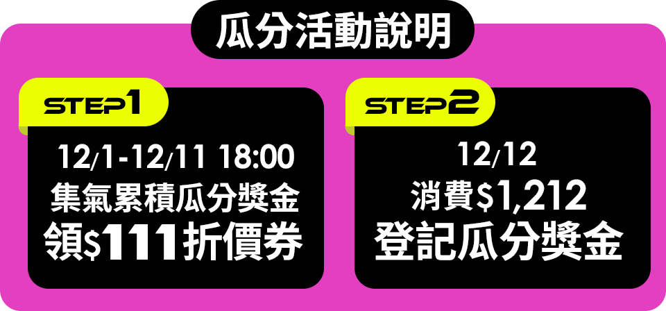 - 12/1 00:00 -12/11 18:00每人每日可集氣一次,集氣一次累積獎金$10、再領當日使用限定$111折價券(當日到期)&12/12限定使用折價券(使用期限至12/12 23:50),最終累積金額為瓜分獎金,最高累積100萬。