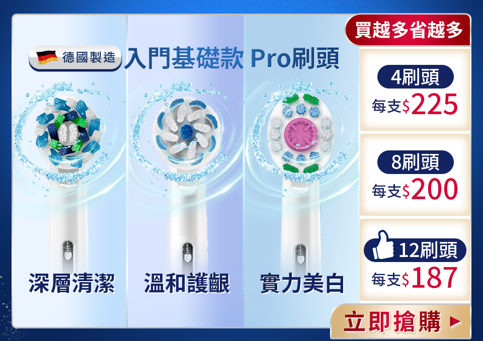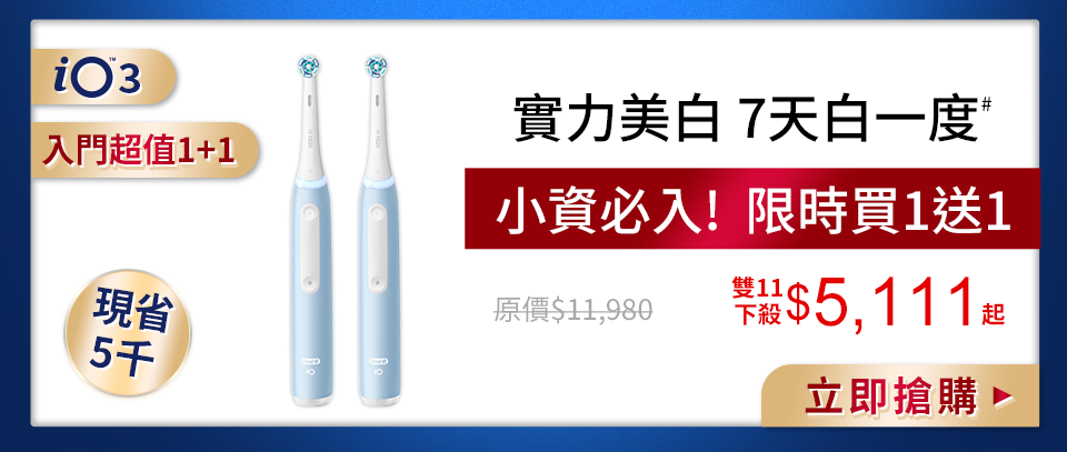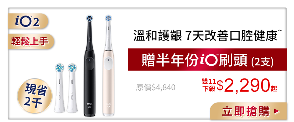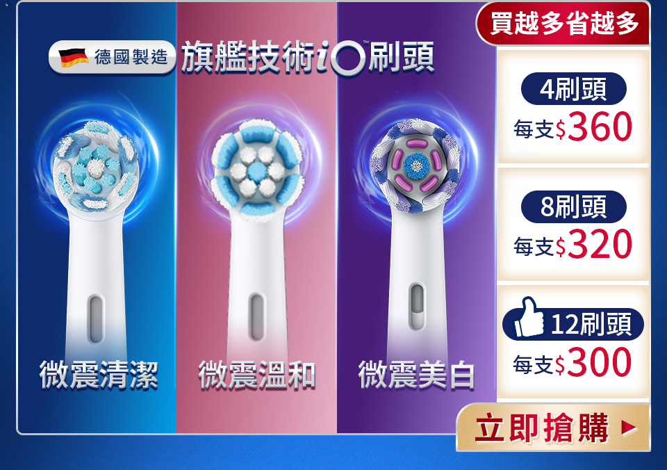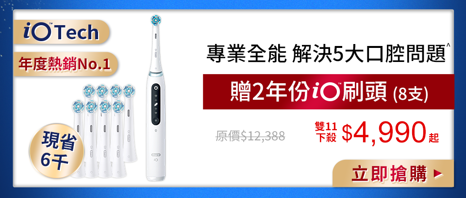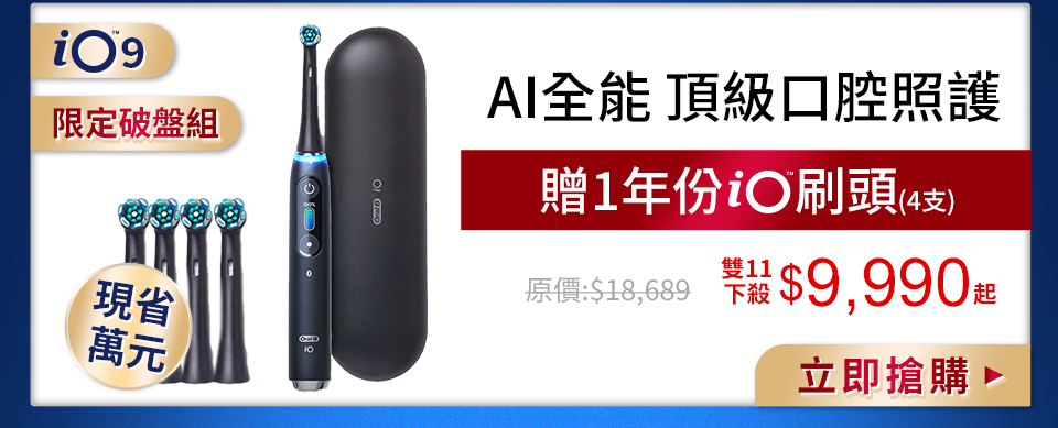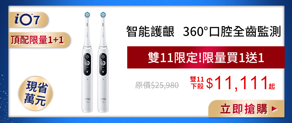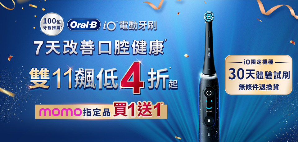 *最終售價及優惠由各通路自行決定,故實際售價及時間以各通路公告為準; #指基於P&G對55名受試者連續使用7天Oral-B iO電動牙刷日常清潔模式,搭配深層清潔刷頭的牙菌斑(膜) 及牙齦健康檢測結果。P&G研發數據,實際效果因人而異;^P&G於2025年7月1日~9月15日委託通路商進行牙醫師產品試用, 基於台灣超過百位牙醫師試用經驗結果;體驗30天不滿意保證退換貨指: #根據P&G委託獨立市場研究機構於2020年10月至2022年6月期間對全球範圍內有代表性牙醫樣本量的調查結果; *最終售價及優惠由各通路自行決定,故實際售價及時間以各通路公告為準; 30天滿意保證體驗指消費者於活動期間2025年09月15日至2025年12月31日(以購買憑證所示日期為準)內,在指定通路恆隆行直營之百貨專櫃、恆隆行官方購物網站(https://shop.hengstyle.com/)、MOMO購物中心、全國電子、燦坤,購買Oral-B iOTech, iO Slim, iO7, iO9,iO10產品, 享有購後30天退貨服務, 具體細則詳見恆隆行官方網站Oral-B品牌公告。;百位牙醫推薦牙刷品牌指P&G於2025年7月1日~9月15日委託通路商進行牙醫師產品試用, 基於台灣超過百位牙醫師試用經驗結果。^ 指減少牙漬、清潔齒縫汙垢、清潔牙齦線菌斑、減少牙齦出血、清潔後槽牙部位。結合正確刷牙方式,持續使用實際效果因人而異; # P&G研發數據,基於P&G對24名受試者試用Oral-B iO電動牙刷美白模式搭配Oral-B iO美白至臻刷頭連續使用7天部分齒面外源性著色去除情況的檢測及第三方機構評審,結合正確刷牙方式,實際效果因人而異; ~ 指基於P&G對55名受試者連續使用7天Oral-B iO電動牙刷日常清潔模式,搭配深層清潔刷頭的牙菌斑(膜) 及牙齦健康檢測結果。P&G研發數據,實際效果因人而異。體驗30天不滿意保證退換貨指: #根據P&G委託獨立市場研究機構於2020年10月至2022年6月期間對全球範圍內有代表性牙醫樣本量的調查結果; *最終售價及優惠由各通路自行決定,故實際售價及時間以各通路公告為準; 30天滿意保證體驗指消費者於活動期間2025年09月15日至2025年12月31日(以購買憑證所示日期為準)內,在指定通路恆隆行直營之百貨專櫃、恆隆行官方購物網站(https://shop.hengstyle.com/)、MOMO購物中心、全國電子、燦坤,購買Oral-B iOTech, iO Slim, iO7, iO9,iO10產品, 享有購後30天退貨服務, 具體細則詳見恆隆行官方網站Oral-B品牌公告。