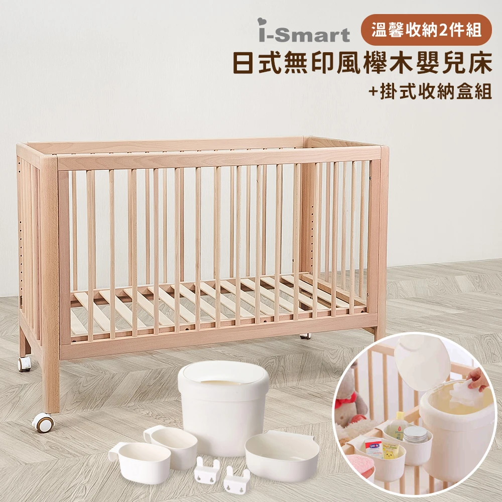 i-Smart 日式無印風櫸木嬰兒床+掛式收納盒組(溫馨收納2件組|嬰兒床組|兒童床|嬰兒床置物架)