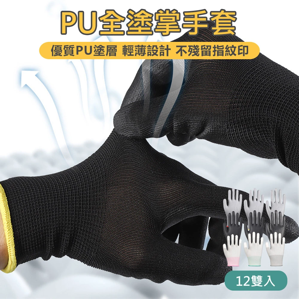 原家居 PU全塗掌手套 12雙入-黑/灰/白(工作手套 防滑手套 沾膠手套 搬運手套 園藝手套 止滑手套)