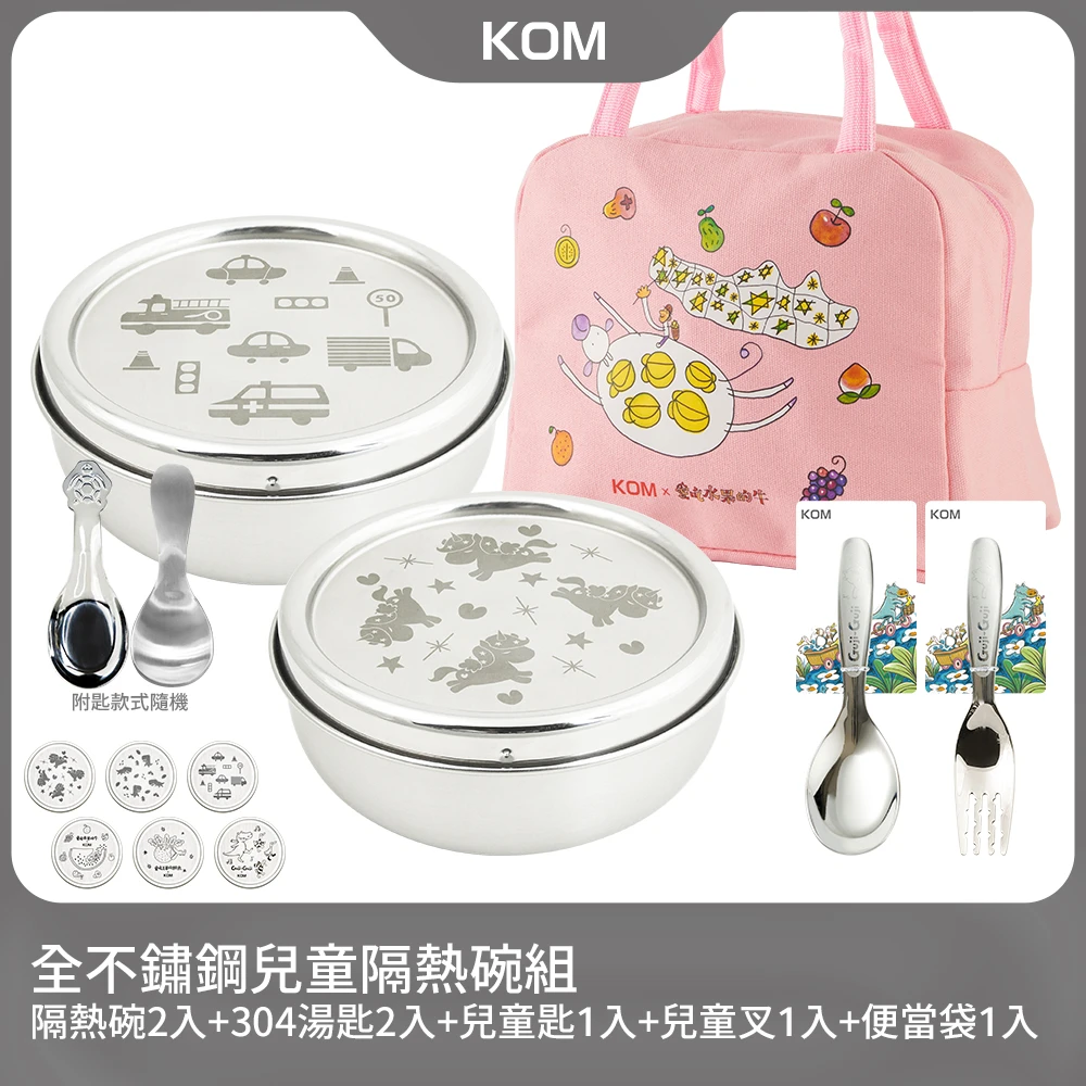 KOM 矽膠/不鏽鋼兒童雙層隔熱碗2入組(碗*2+304湯匙*2+叉匙組*1+便當袋*1 信誼聯名/嘉年華/童趣系列)