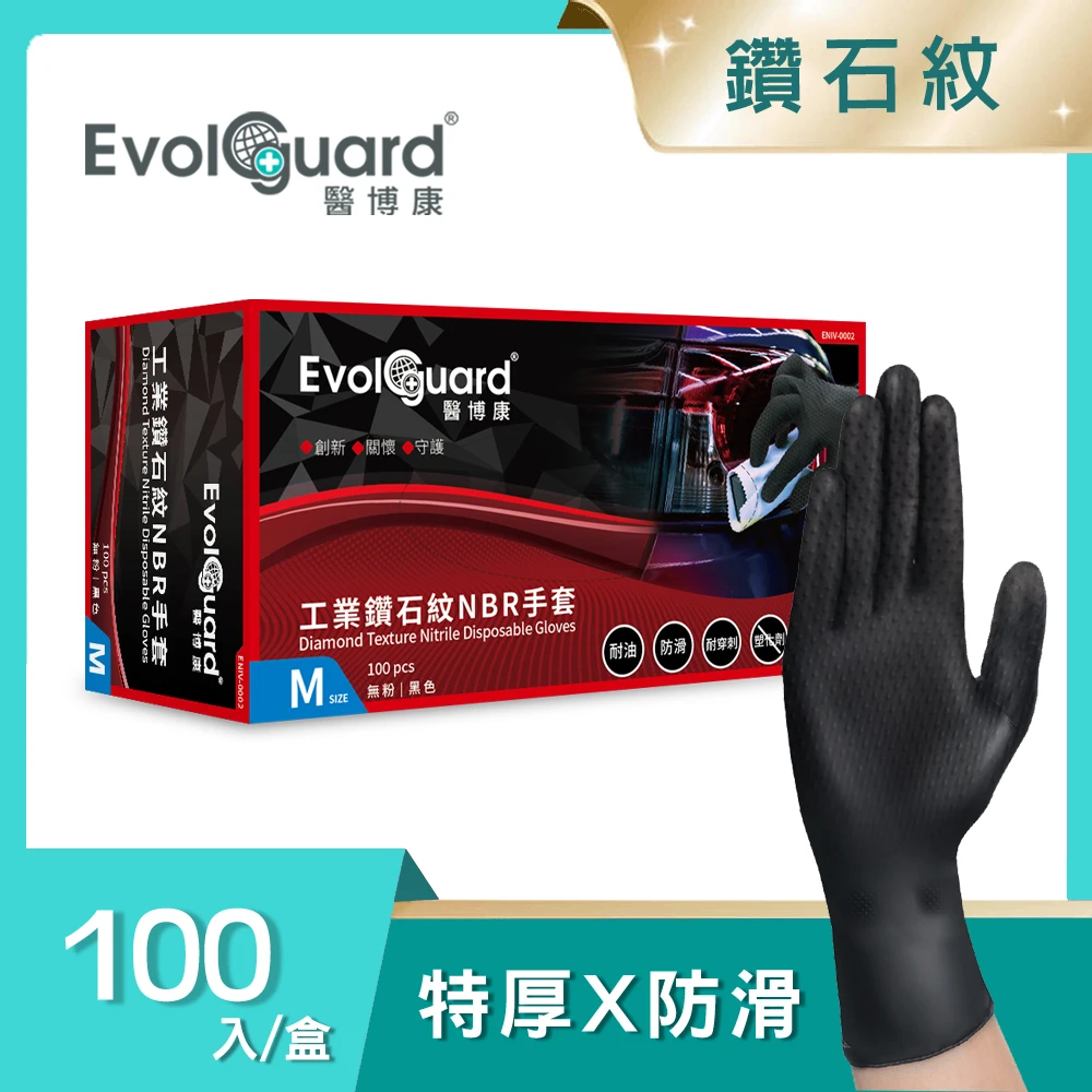 【Evolguard 醫博康】工業鑽石紋丁腈NBR手套 100入/盒(黑色/汽修/特厚/防滑/一次性手套)【Evolguard 醫博康】工業鑽石紋丁腈NBR手套 100入/盒(黑色/汽修/特厚/防滑/一次性手套)
