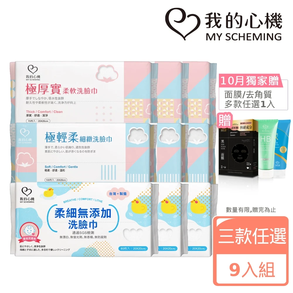 我的心機 極輕柔細緻洗臉巾9入(三款任選-珍珠紋70抽/平織紋100抽/寶寶用柔細紋80抽)