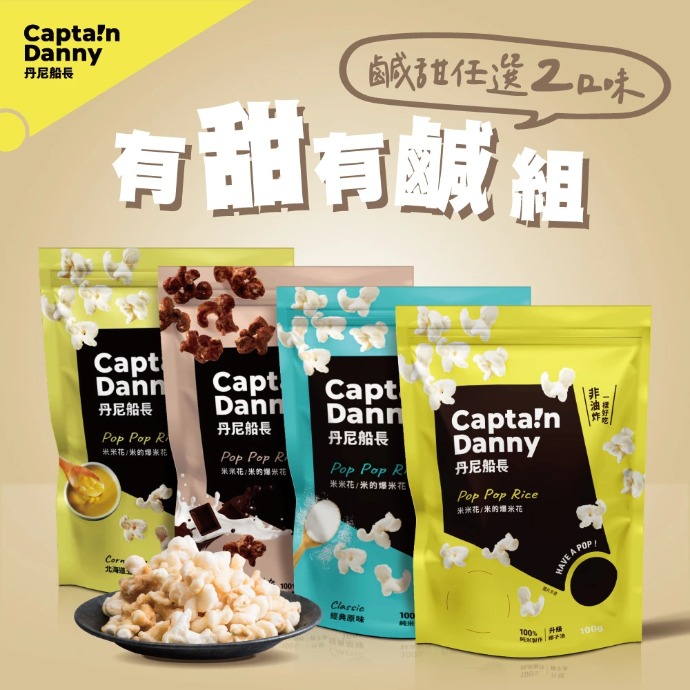 丹尼船長 米米花有甜有鹹組100gx4包組(甜鹹各選兩口味 純米製非油炸烘烤爆米花零食)