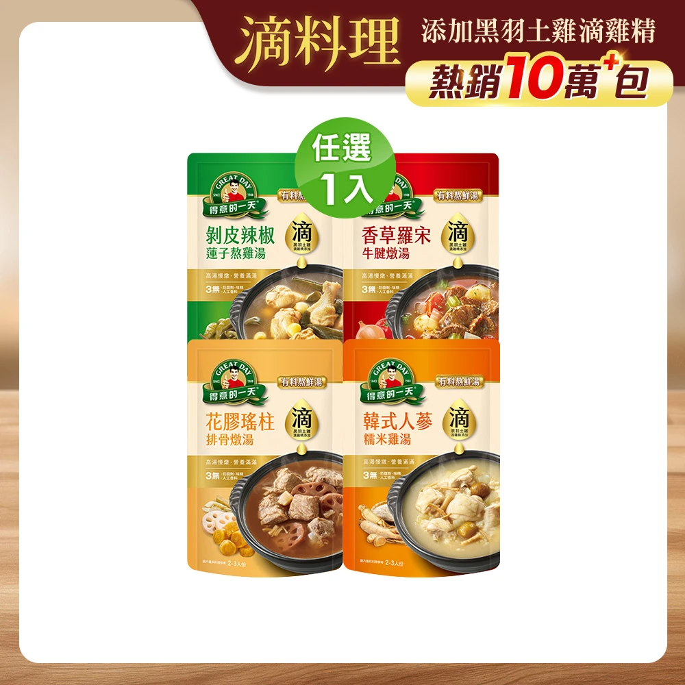 得意的一天 有料熬鮮湯口味任選x1入(花膠瑤柱排骨/人蔘雞/牛腱湯/肉骨茶/酸白菜/剝皮辣椒/燉牛肉)