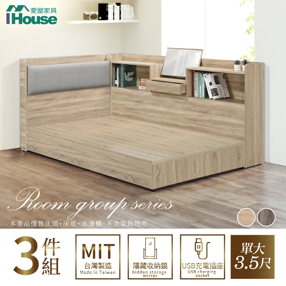 IHouse 沐森 房間3件組-單大3.5尺(插座床頭+床底+收納床邊櫃)