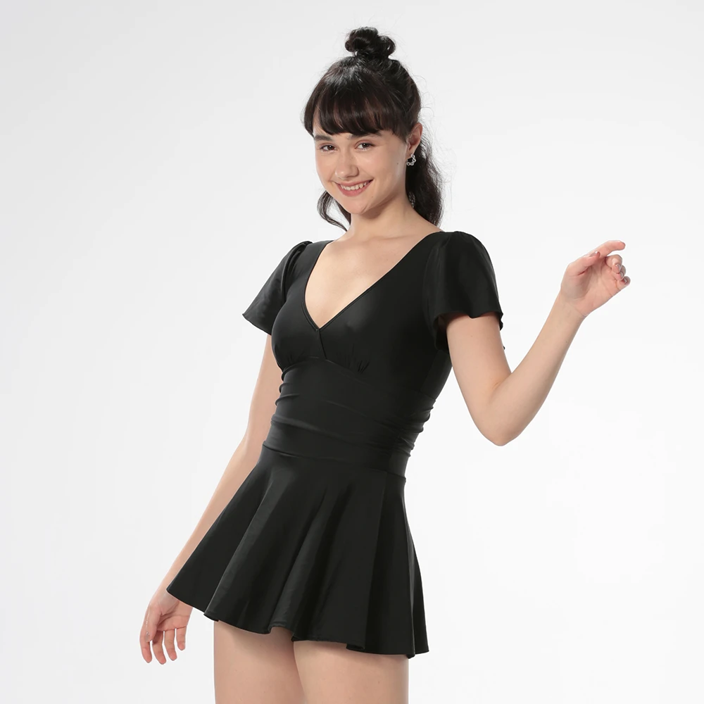 haolang 浩浪 經典黑短袖四角連身裙泳衣(13604)