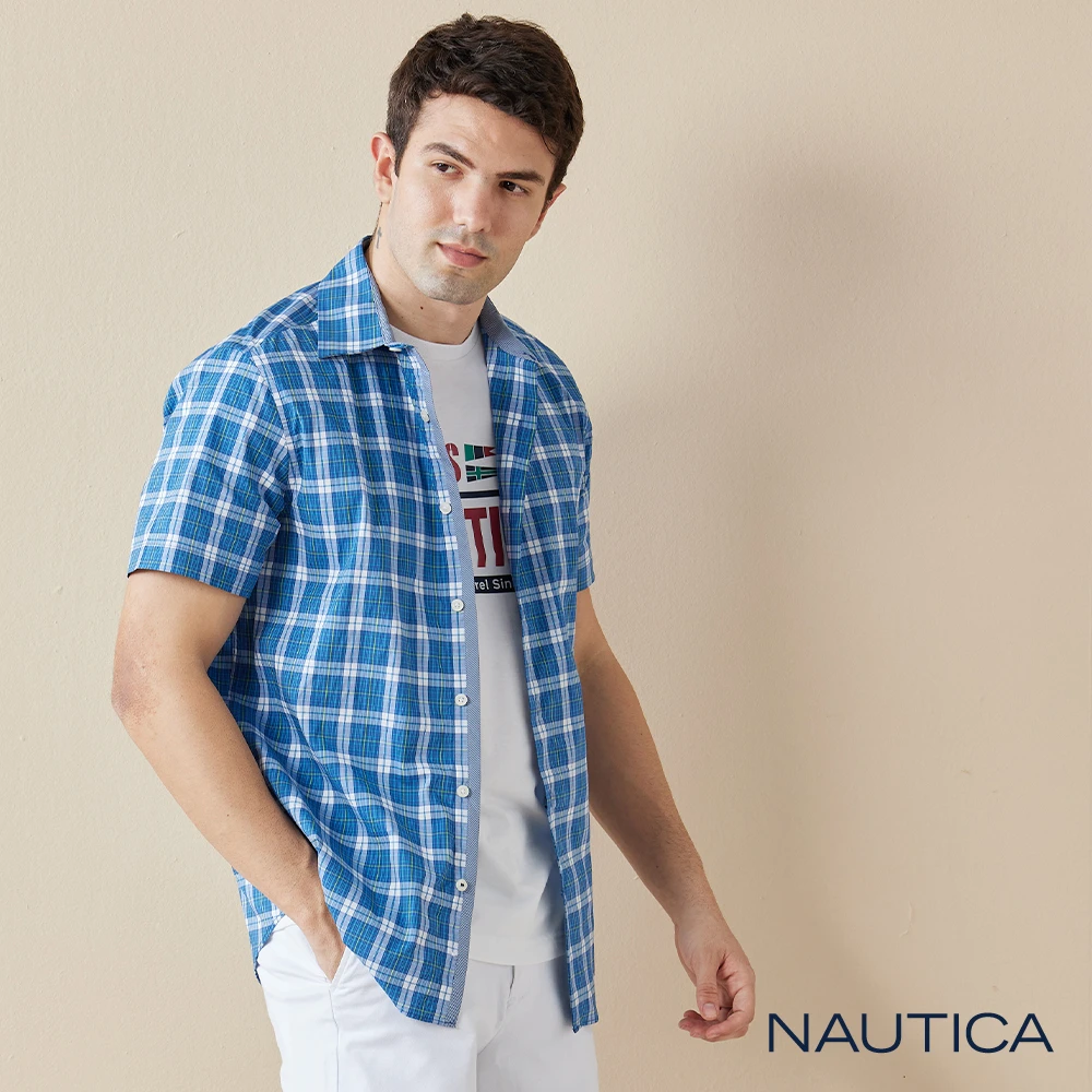 NAUTICA 男裝 海洋風格紋透氣短袖襯衫(深藍色)
