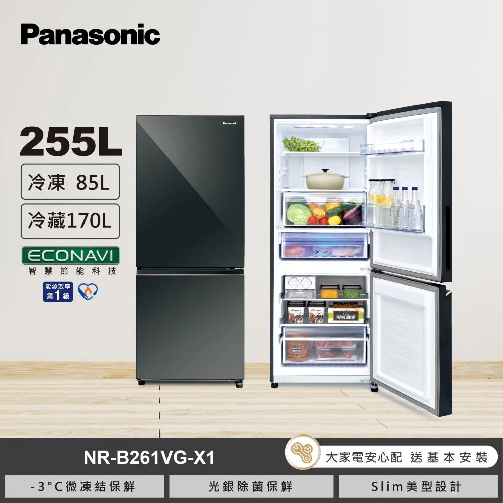 Panasonic 國際牌 58H快配★255公升一級能效玻璃門雙門變頻冰箱-鏡面鑽石黑(NR-B261VG-X1)