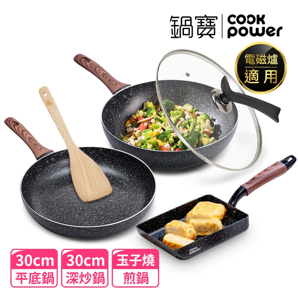 CookPower 鍋寶 原礦大理石IH不沾鍋三鍋五件組-IH爐可用鍋(30炒+30煎+玉子燒鍋+30蓋+鏟)