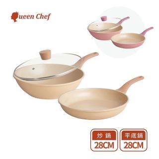 Queen Chef CREAM 韓國厚釜鑄造米陶瓷不沾鍋雙鍋3件組(炒鍋+平底鍋+蓋 交換禮物)