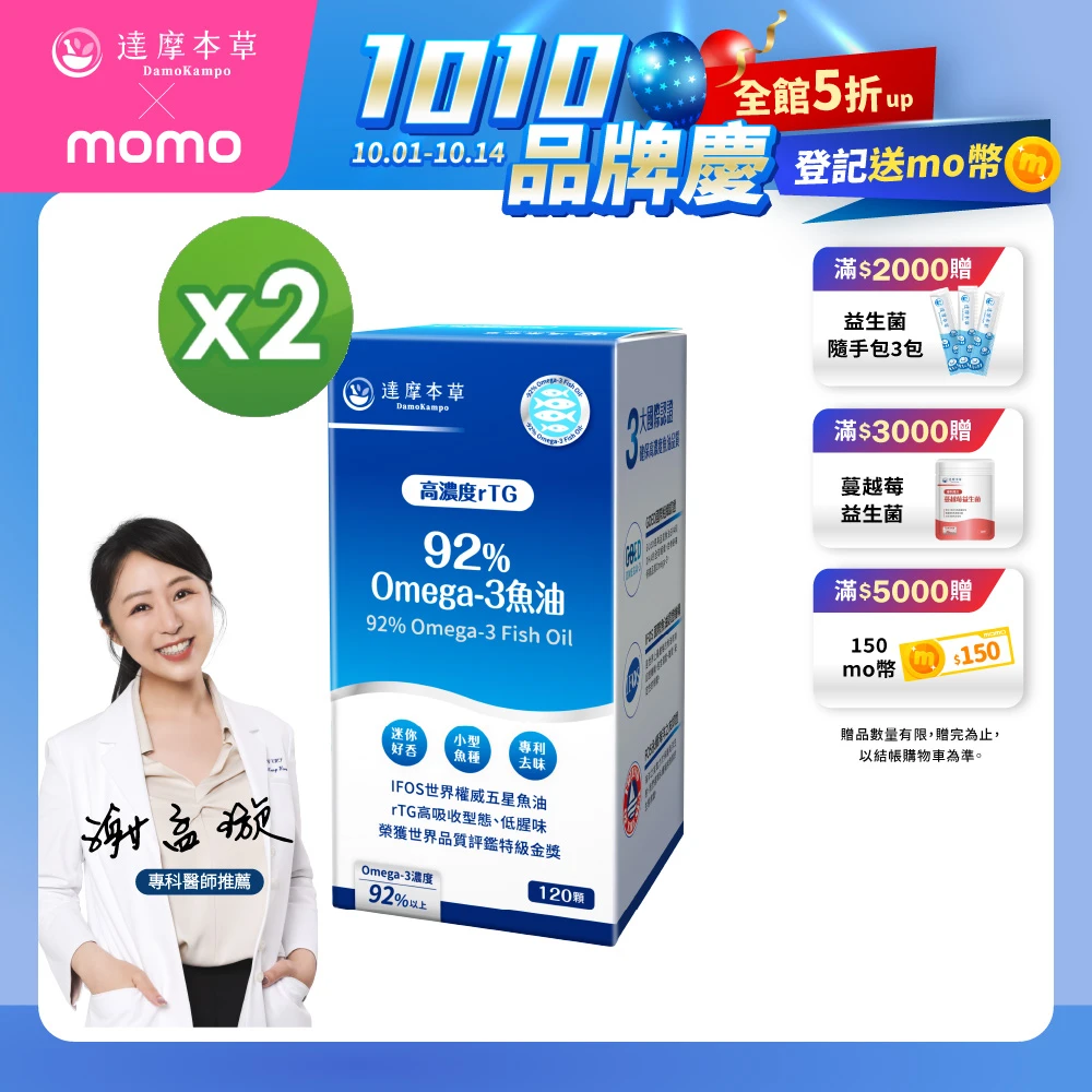 達摩本草 92% Omega-3 rTG高濃度魚油EX 2入120顆/盒(醫生推薦、金質獎肯定)