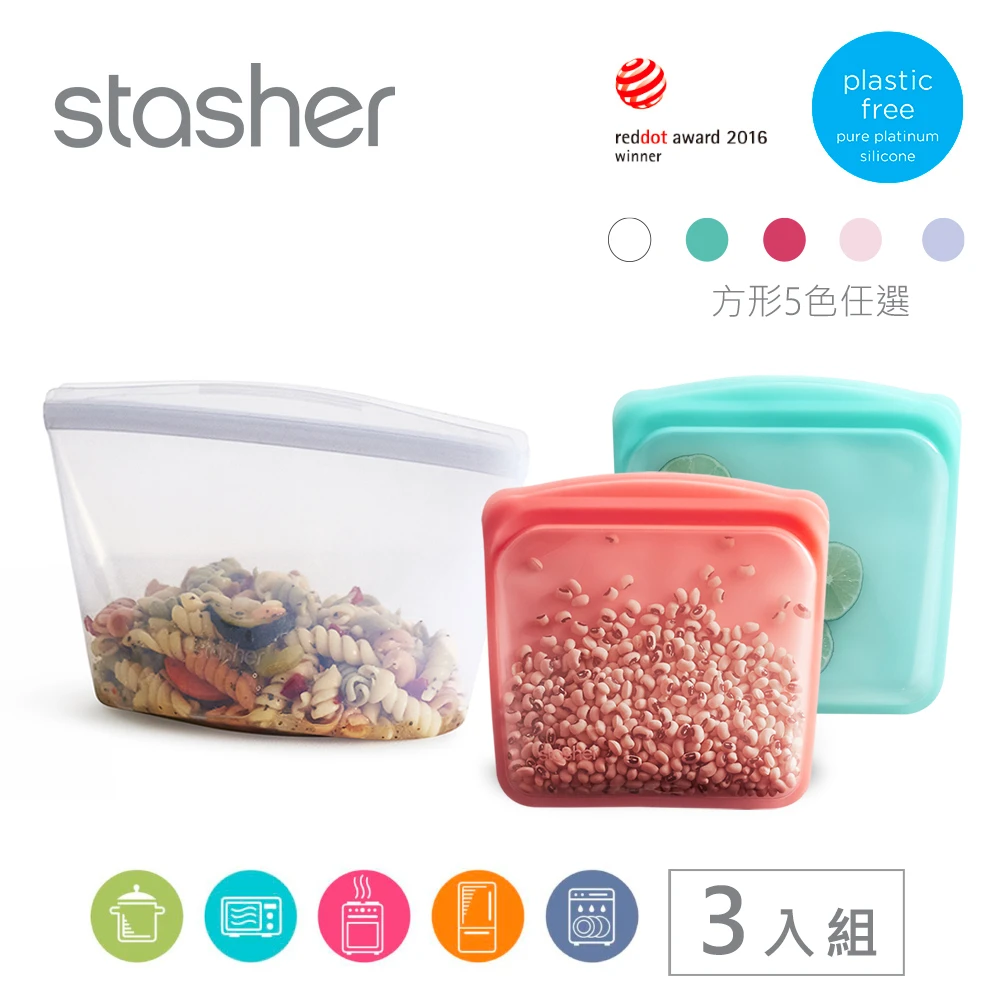 美國Stasher 獨家碗形方形3入組_白金矽膠袋/密封袋/食物袋(保鮮袋/收納袋)
