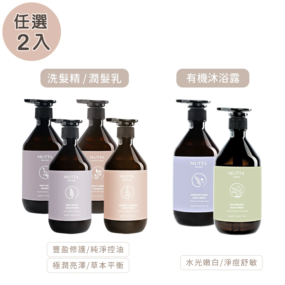 MUTTA 沐塔 洗髮精/潤髮乳/沐浴乳500mlx2入組(豐盈修護/純淨控油/極潤亮澤/草本/淨痘舒敏/嫩白)
