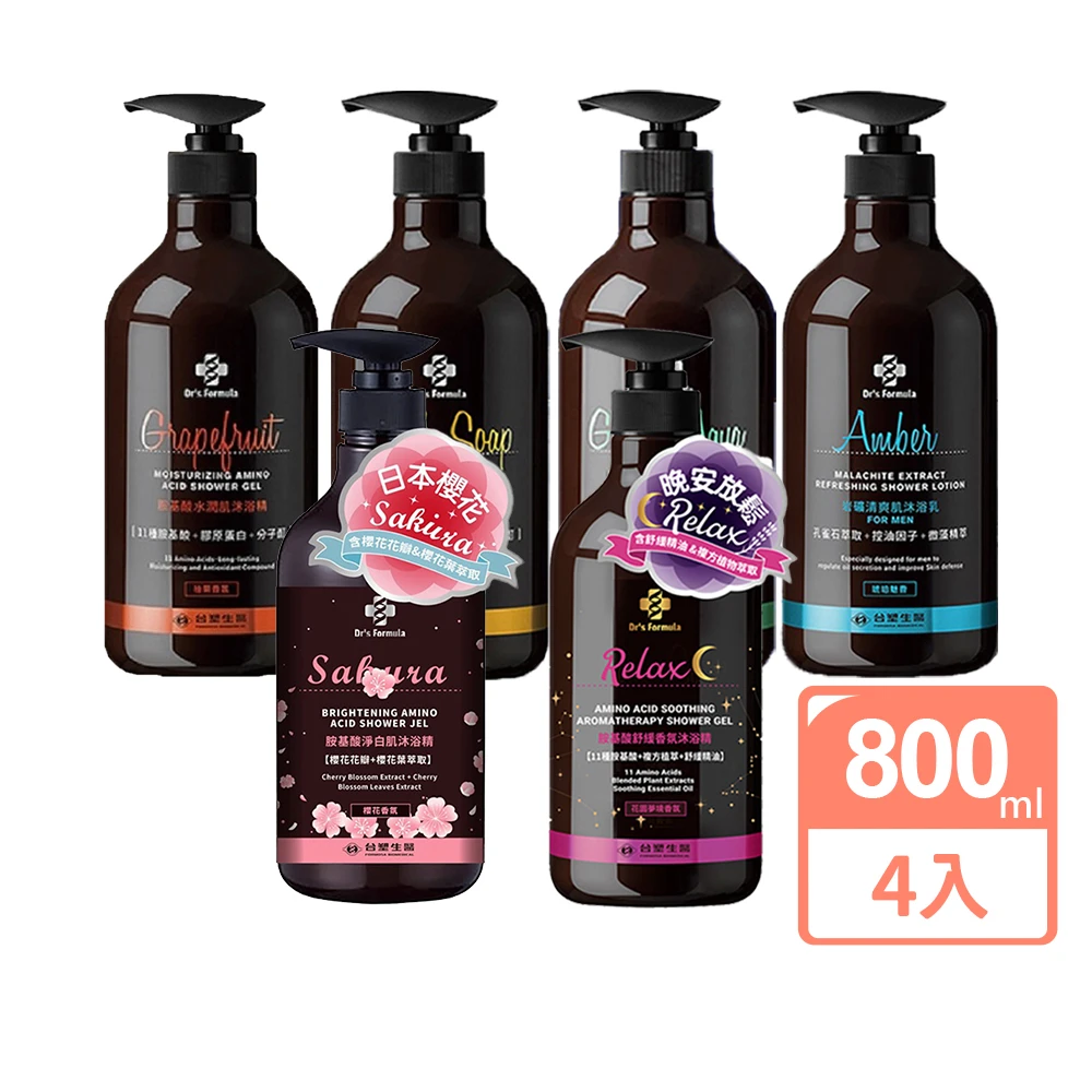 Dr’s Formula 台塑生醫 香氛沐浴乳 800mlx4入組(柚香/琥珀/雪皂/碧泉/櫻花)
