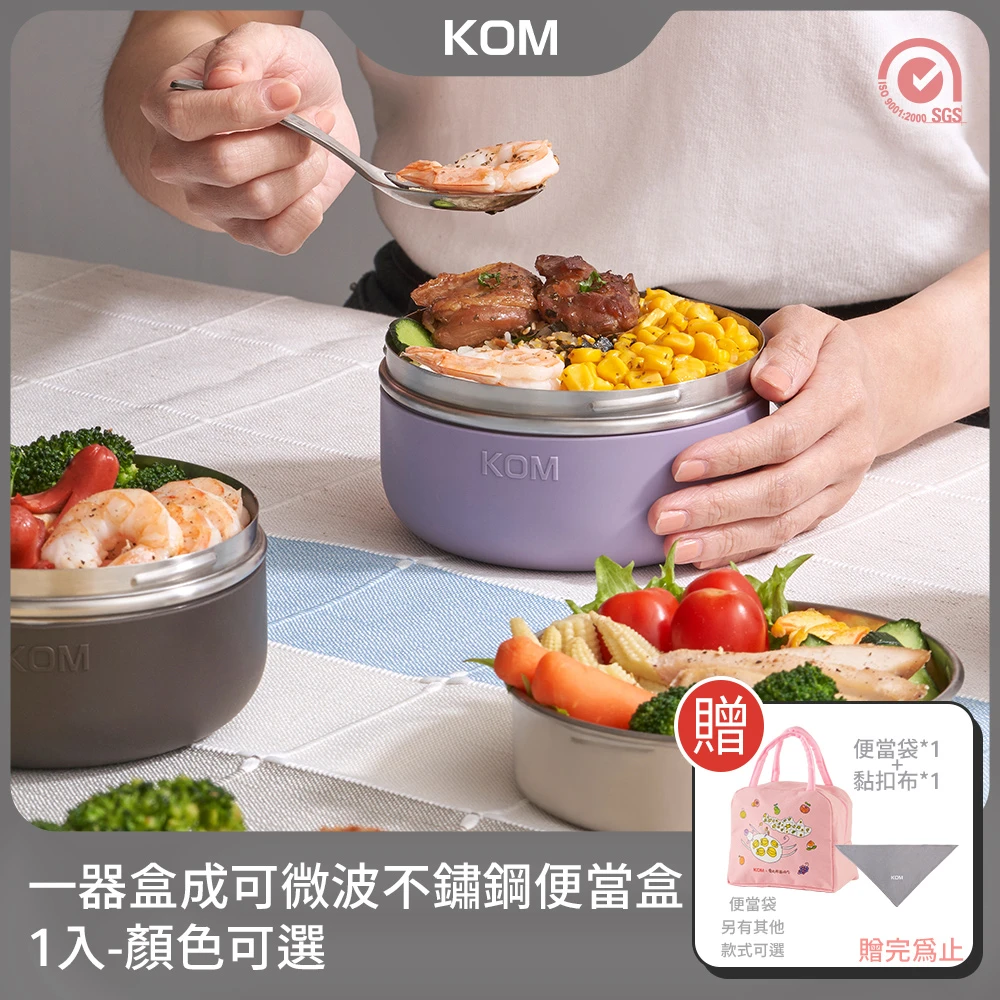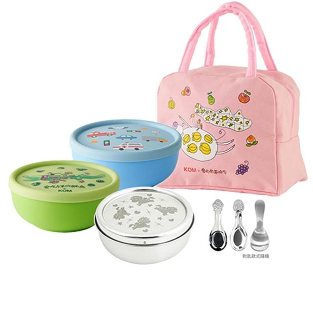 KOM 一器盒成|可微波不鏽鋼便當盒1入另贈便當袋+黏扣布(飯碗/湯碗/菜盤/湯匙/隔熱套)