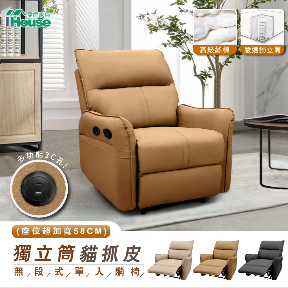 IHouse 獨立筒貓抓皮休閒沙發/無段式單人躺椅/1人沙發/休閒椅(座位超加寬58CM)