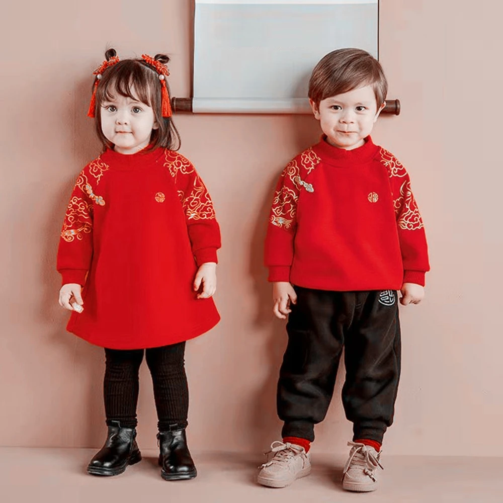 橘魔法 祥雲福字棉絨套裝(長袖上衣 褲子 長褲 洋裝 新年 過年 大紅 拜年服 刷毛 兒童 男童 女童 童)