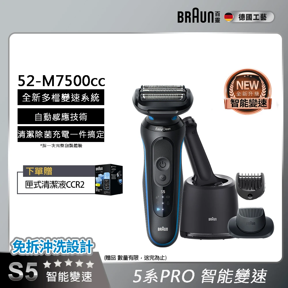 德國百靈BRAUN 智能變速 5系列PRO免拆快洗電動刮鬍刀/電鬍刀 清潔充電座組(52-M7500CC)