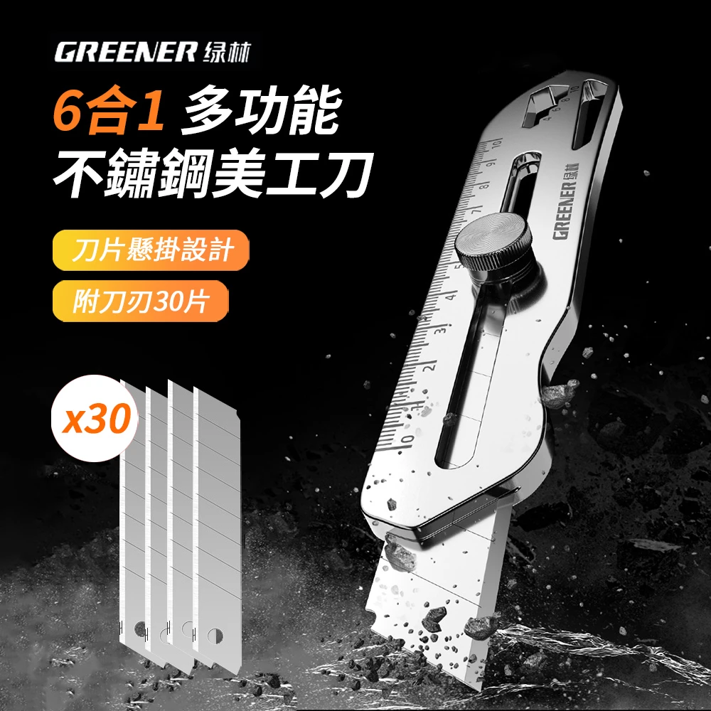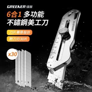 GREENER 6合1多功能不鏽鋼拆快遞美工刀 多用途全鋼工具刀 贈刀刃30片