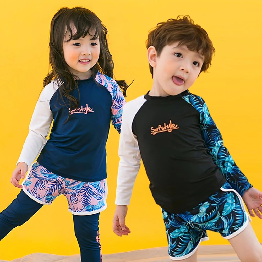 橘魔法 衝浪風長袖泳衣+長褲+短褲(三件式 泳褲 防曬 水母衣 潛水衣 大童 女童 男童 兒童 泳裝)