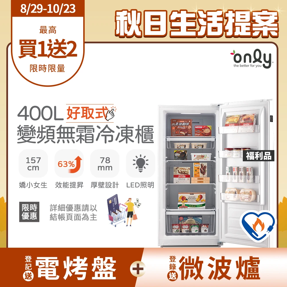 only 熱賣近百台!好取式400L變頻無霜冷凍櫃OU400-M02ZI福利品(節能標章400公升直立式)