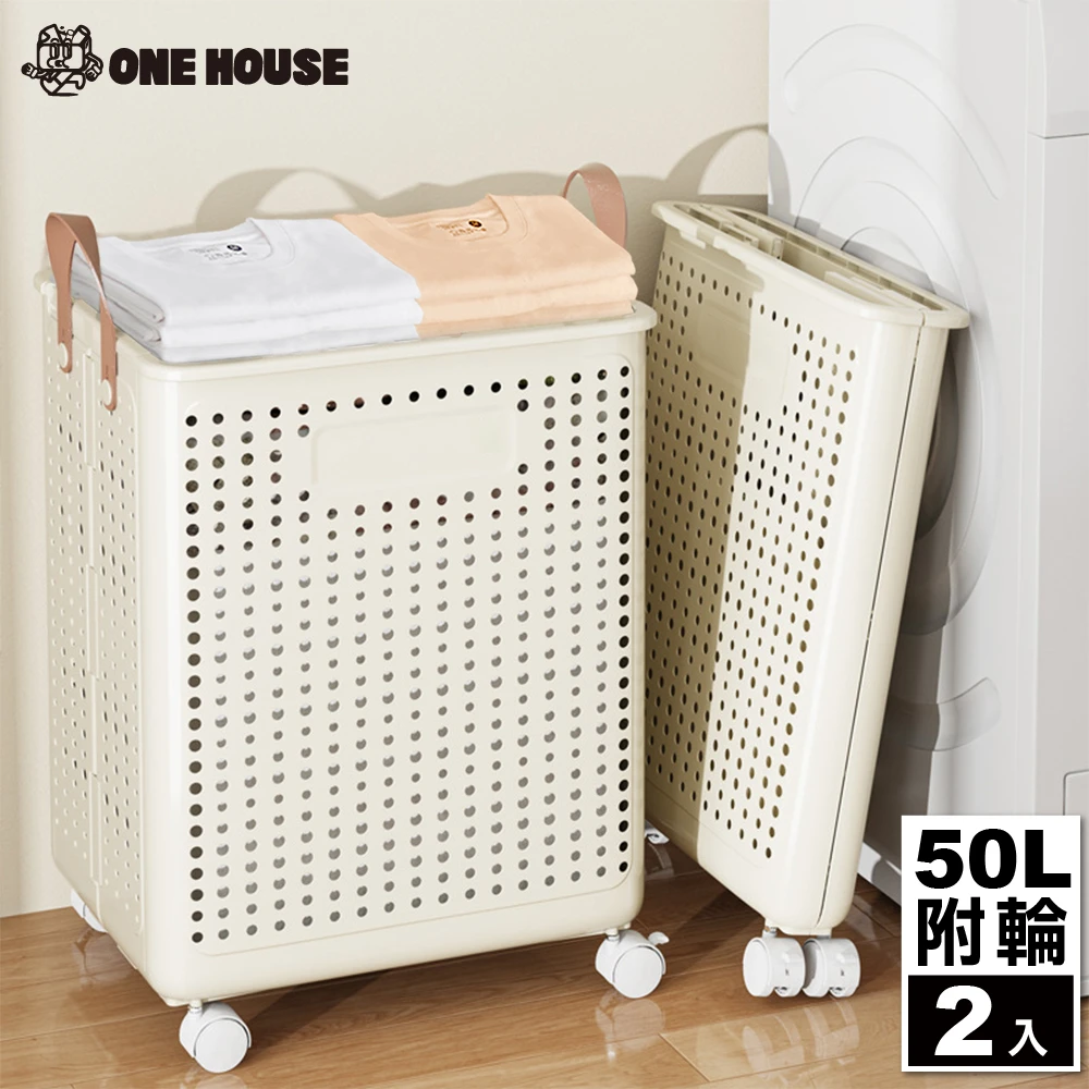ONE HOUSE 50L 田川帶手把折疊收納籃 收納箱 洗衣籃-附輪款(大款 2入)