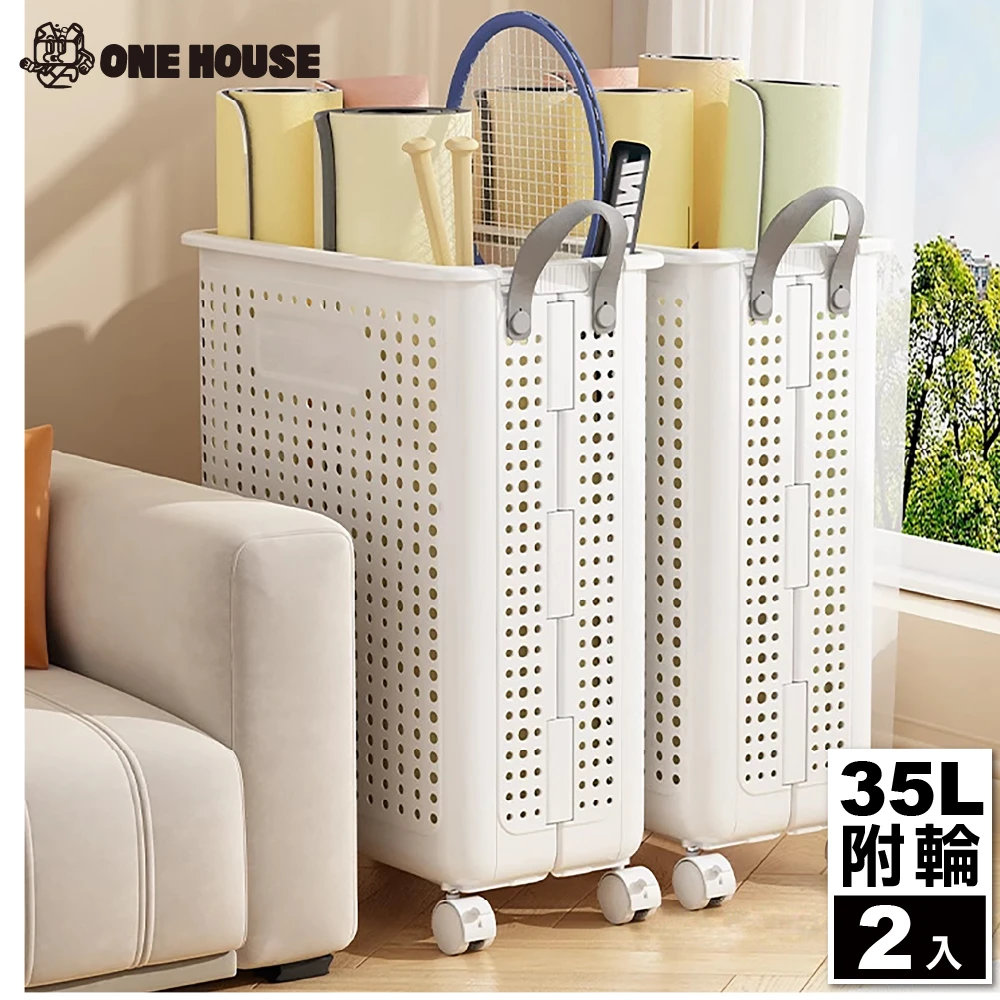 ONE HOUSE 35L 田川帶手把折疊收納籃 收納箱 洗衣籃-附輪款(中款 2入)