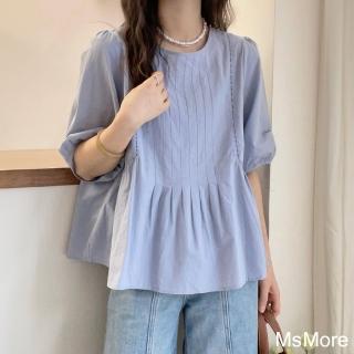 預購 MsMore 泡泡短袖褶皺A字圓領風琴摺娃娃衫短版上衣#122661(白/粉紅/藍)