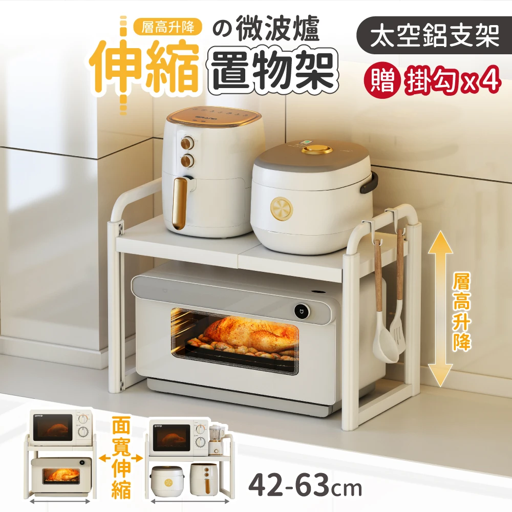 慢慢家居 層高無段調節-可伸縮太空鋁超耐重微波爐置物收納架(電器架 微波爐架 置物架 收納架)