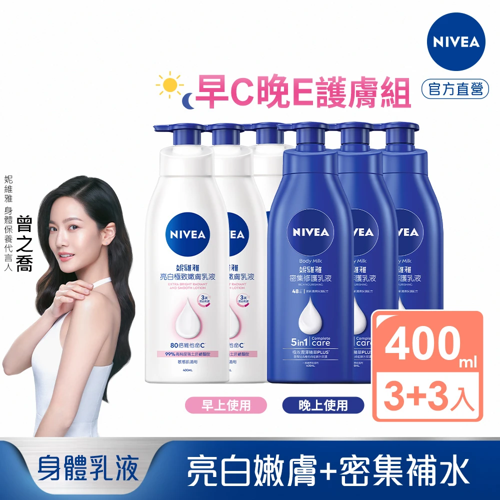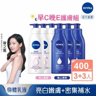 NIVEA 妮維雅 早C晚E組★亮白極致嫩膚乳液400mlx3入+密集深層修護乳液400mlx3入(No.1 美白身體乳)