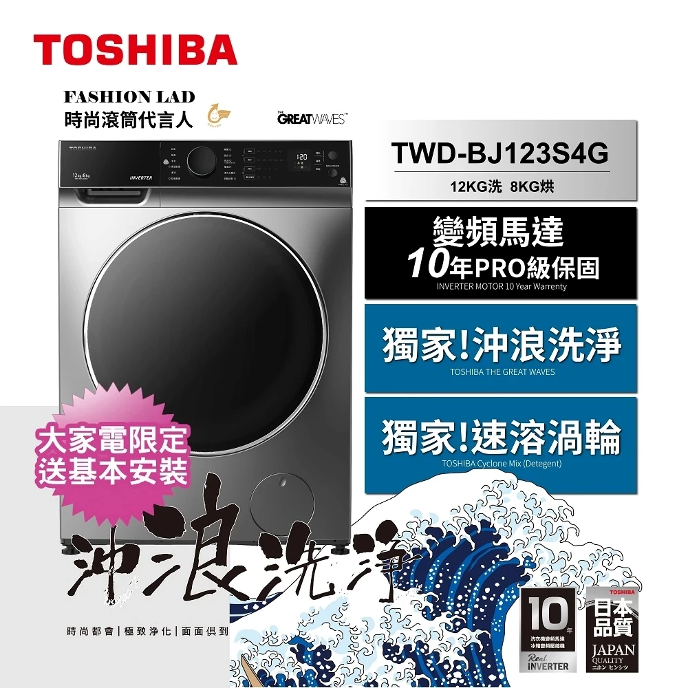 TOSHIBA 東芝 58H快配★12公斤時尚變頻滾筒洗脫烘洗衣機(TWD-BJ123S4G)