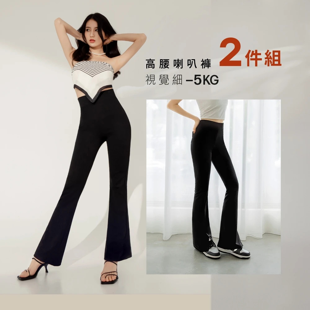 OB 嚴選 買一送一 2件組-視覺細-5KG.高腰彈性喇叭小黑褲高彈款+開衩升級款(買一送一/喇叭褲/黑褲/高腰)