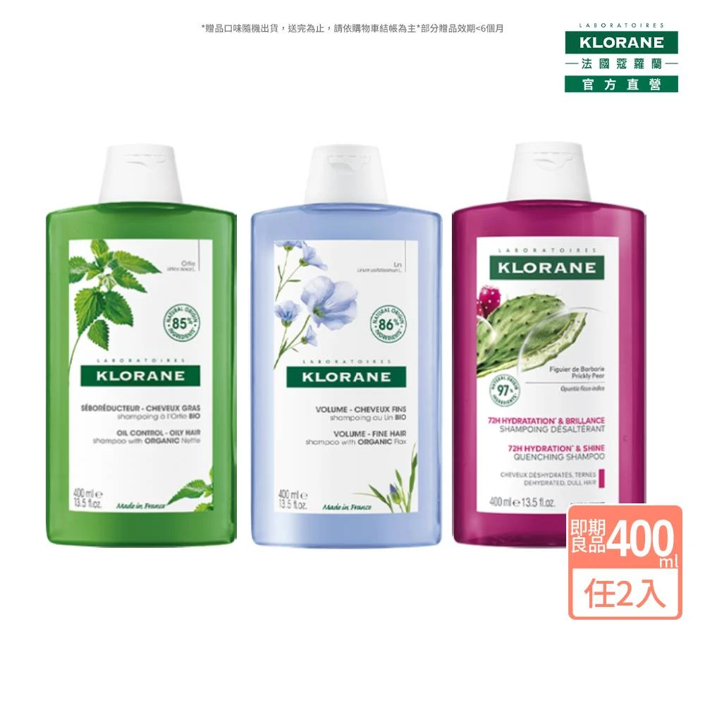 即期品 KLORANE 蔻蘿蘭官方直營 任選2入植萃洗髮精 400ml(控油/澎鬆/保濕)